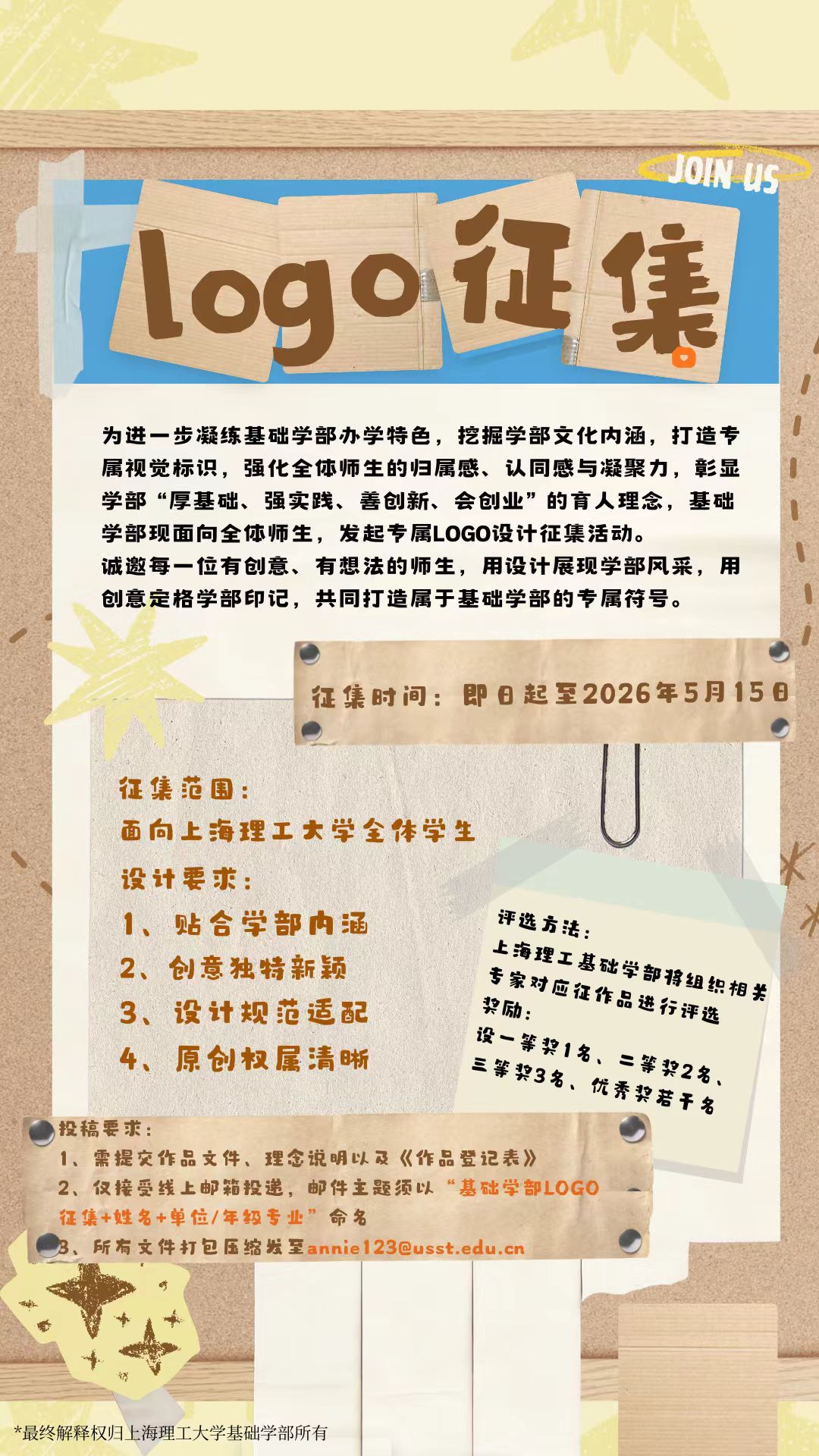 以创意为笔,以心意为墨,诚邀各位师生积极参与、踊跃投稿,用独特的设计,为基础学部打造一张专属的视觉名片,共筑学部文化新印记!