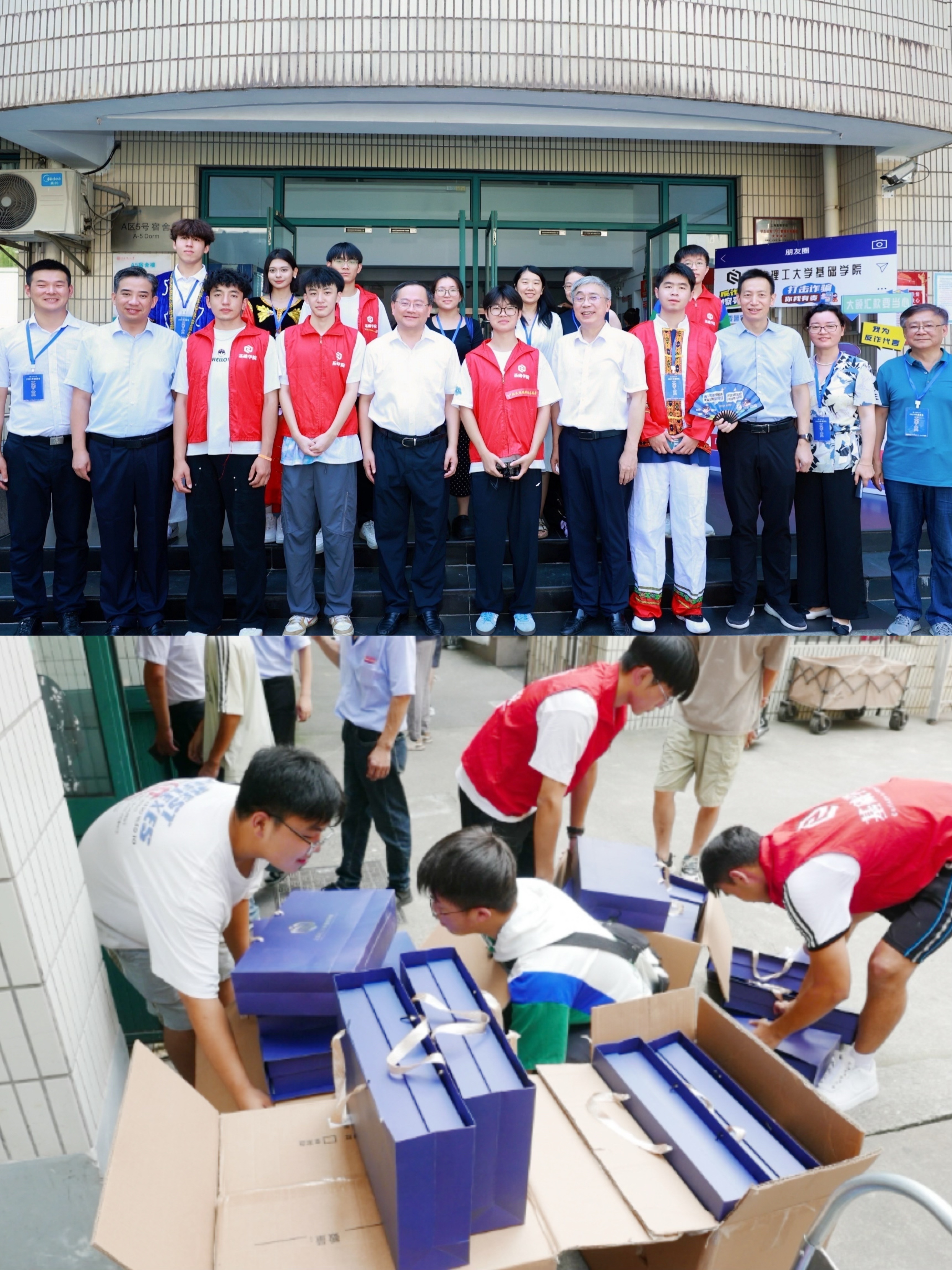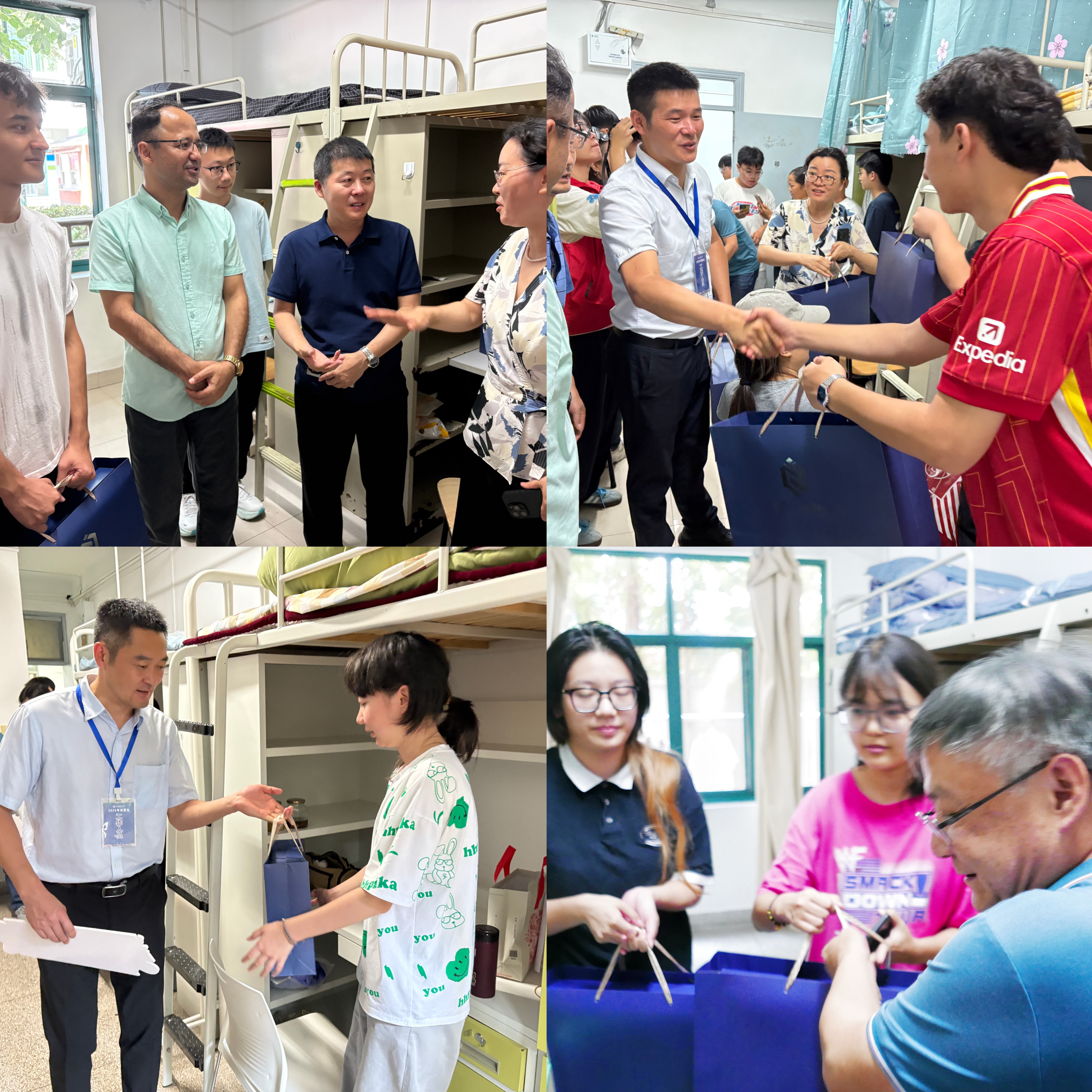 “孩子第一次离家,在学校习惯吗?”校党委书记王凌宇、校长朱新远走进宿舍,拉着家长的手慰问,为新生递上装着笔记本、校园地图的迎新大礼包,叮嘱“有困难找学校”。